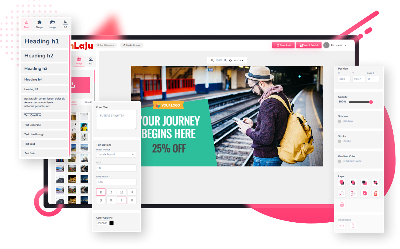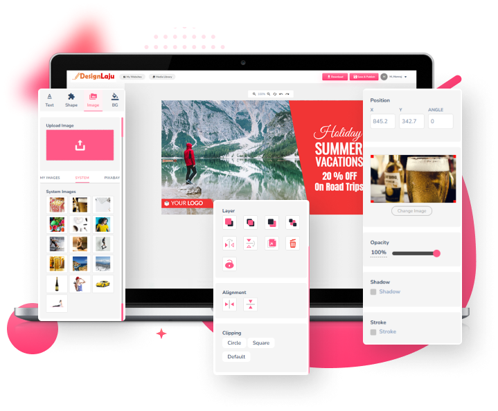 DesignLaju mempunyai pelbagai aset seperti bentuk asas, pembahagi, lencana, dan banyak lagi untuk mempertingkat rekaan anda. Sesuaikan setiap bentuk dengan mudah dengan menyesuaikan saiz, warna, kelegapan, dan tetapan lain. Anda juga boleh menambah bentuk tersendiri ke dalam perpustakaan untuk pilihan lebih banyak. Cipta rekaan yang menonjol dengan DesignLaju hari ini.