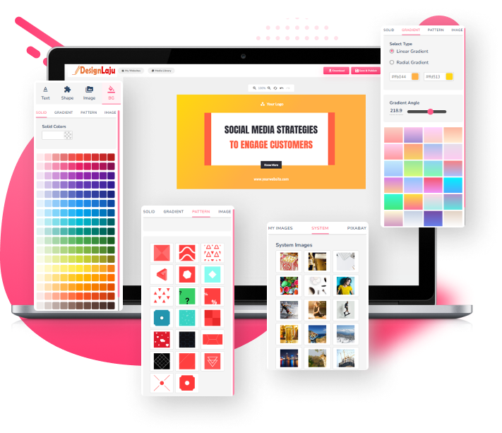 Editor DesignLaju menyediakan pilihan latar belakang boleh disesuaikan seperti warna pepejal, gradient, corak, atau imej. Anda juga boleh menggunakan warna anda sendiri, gradient, dan imej untuk mencipta rekaan menarik. Sesuaikan latar belakang anda supaya sesuai dengan keperluan anda dengan DesignLaju.