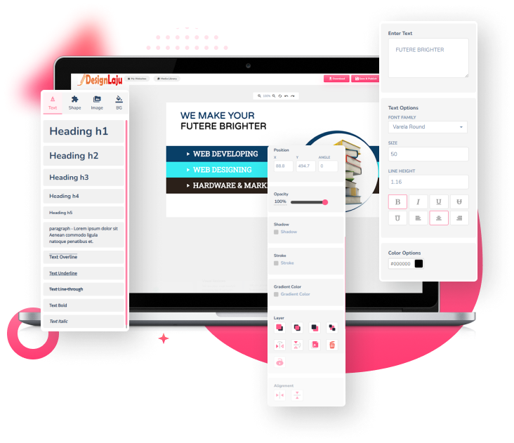 Editor DesignLaju menawarkan pelbagai pilihan tipografi untuk menyesuaikan tajuk, perenggan, dan elemen lain dengan gaya fon, warna, saiz, dan tinggi baris. Anda juga boleh menambah gradient, garisan tepi, dan bayang-bayang untuk membuat teks anda menonjol dan menarik pembaca. Dengan tipografi, anda boleh mencipta kandungan yang menarik dan memberi impak.